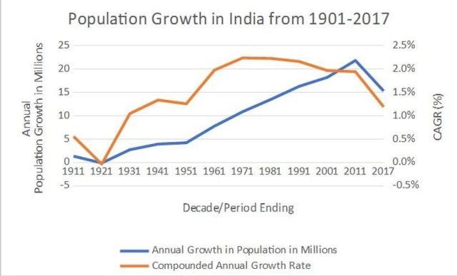 Since Punjab supplies food for the rest of India, it’s useful to consider the population growth of India as a driver for Punjab’s agricultural growth.