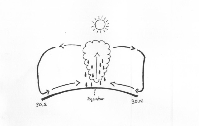 What does this have to do with water? Whichever latitude the sun shines brightest on, the air over the surface heats up and rises (see figure below). Nature abhors a vacuum, and so air from the surrounding latitudes rush to fill the gap. These winds often carry moisture when they pass over the seas, and, as they converge and rise, they release the moisture as rain. That’s why it rains so much over the equator, where the band of maximum heating often lies. The band of clouds and rain follow the sun, but with a time lag – as handmaidens follow a queen.
