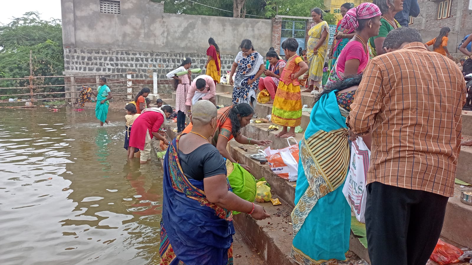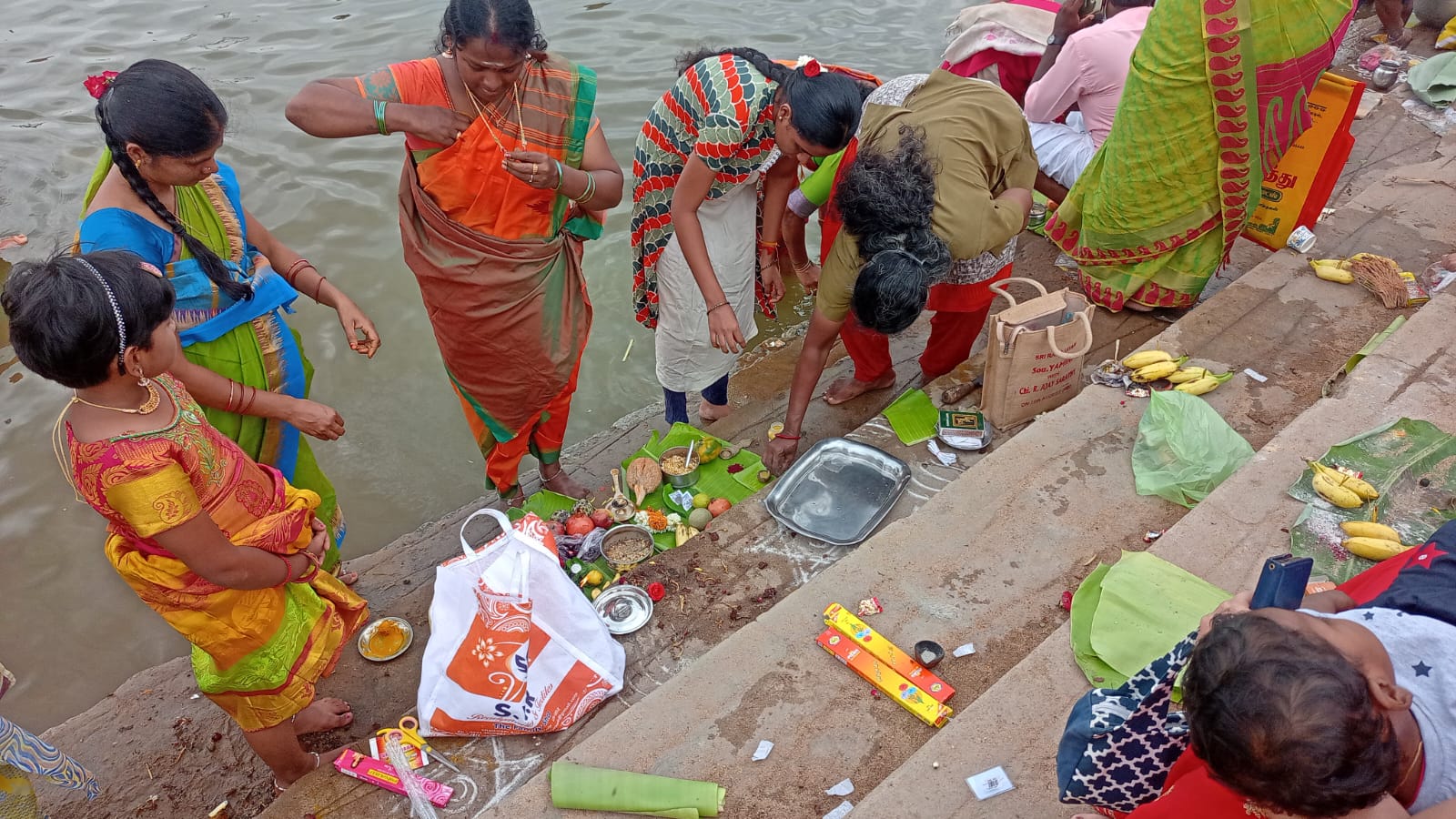 In Aadi Perukku, some women take the Mulaipari they have been tending to so carefully, and offer it to the river goddess, praying for a bountiful harvest. Young girls take kadholai (earrings made from palm leaves) and karumani (black beads) and offer it to the river goddess. Newly weds come to river praying for offspring. Women tie yellow threads smeared with manjal (or turmeric) praying for the long lives of their husbands. The festival is about praying for fertility, for prosperity by respecting the water that makes it all possible