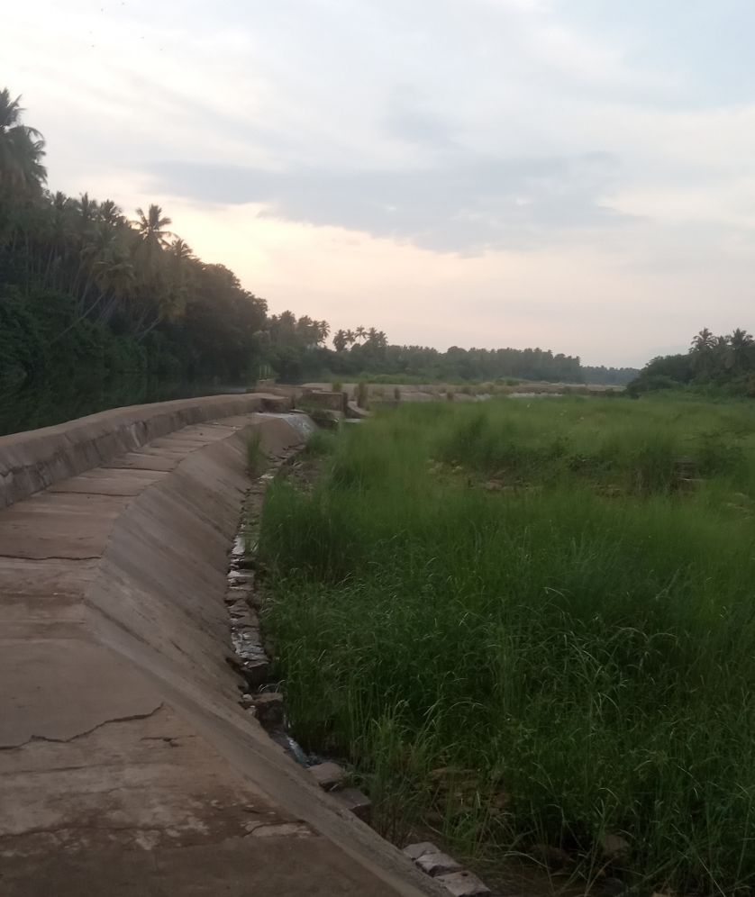 The Sitranai (literally small check dam) is a gently semi-circular granite check dam built across the Vaigai near a village called Kuruvithurai, an hour’s drive from Madurai. My husband and I drove on a narrow well-paved road cleaving through rice fields and coconut farms, until we came to a dirt track veering towards the river – there was no signage. We turned right, and within a minute came to the Sitranai. It was twilight and the granite glowed a pale peach in the rays of the setting sun. The massive dam arced across the river, the water cascading down it sides. There were people bathing in the foaming cascades while small white birds hovered over the water, searching for fish.